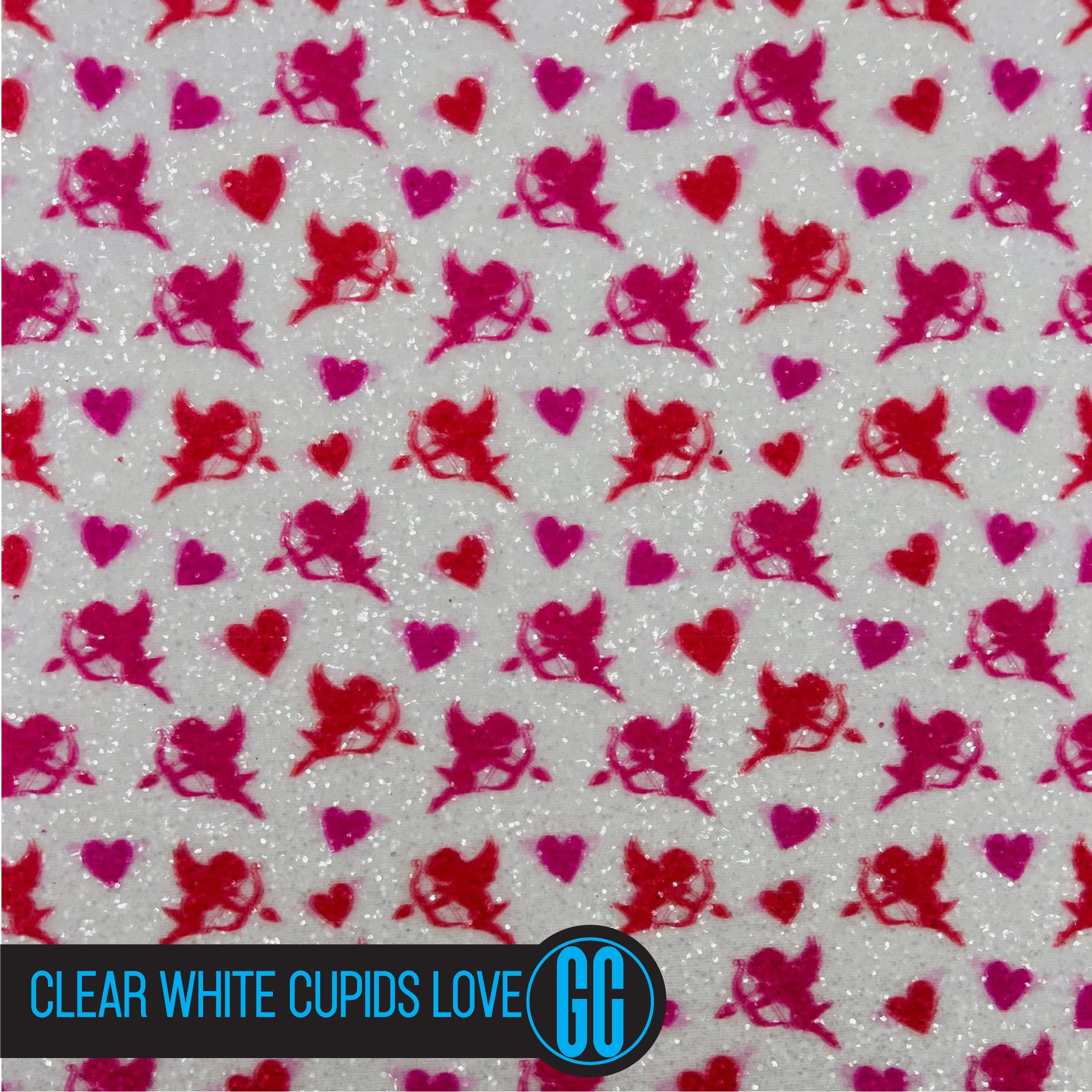 100% Cotton backed Clear White Cupids Love Pattern Glitter Fabric. Available in A4 Size.