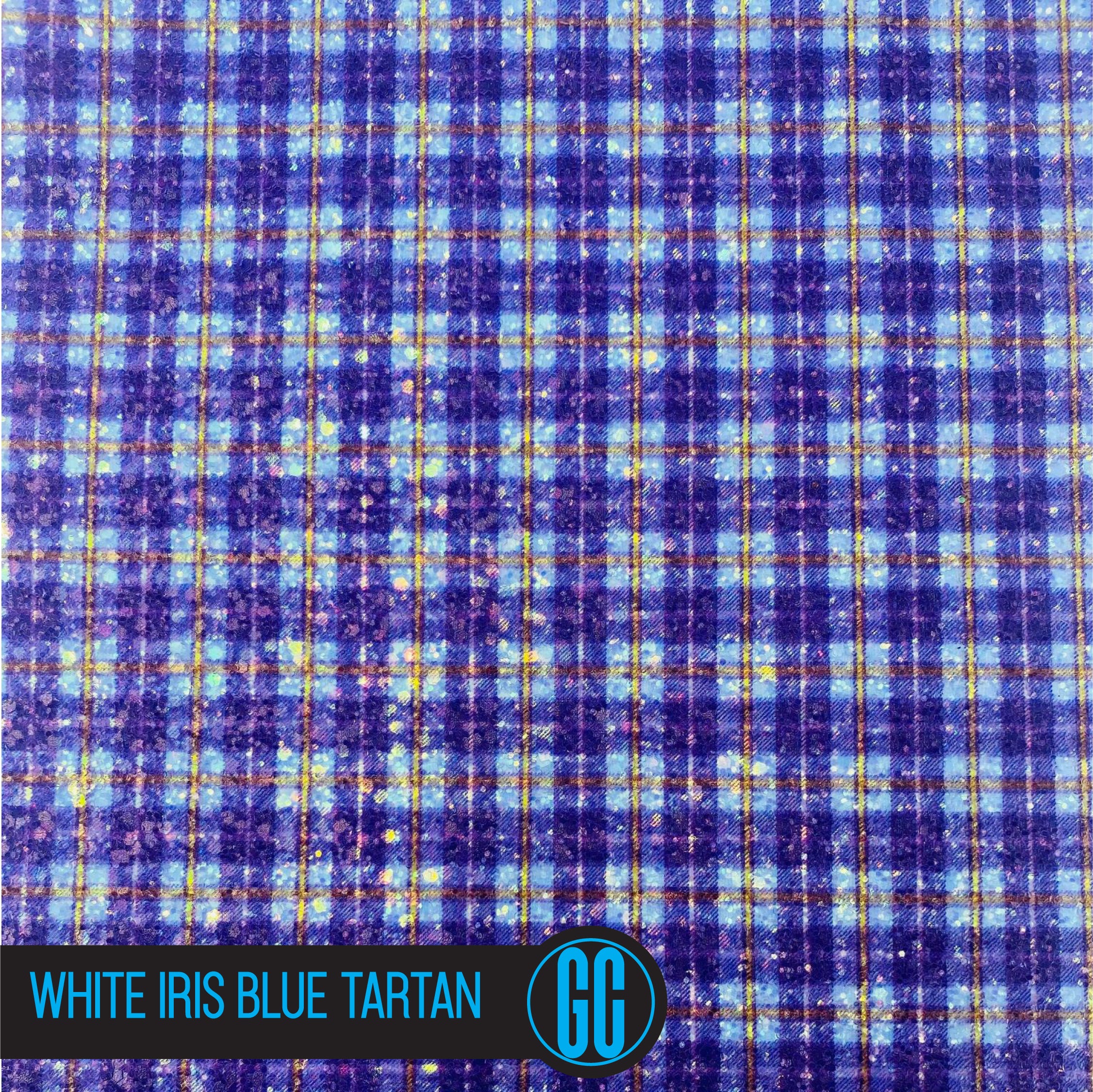 100% Cotton backed White Iris Blue Tartan Printed Glitter Fabric. Available in A4 Size.