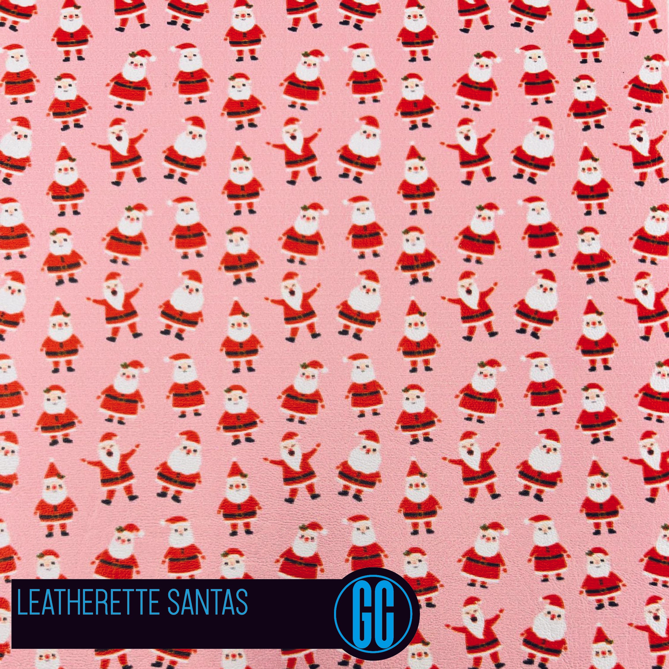100% Cotton backed Leatherette Santa's Printed Glitter Fabric. Available in A4 Size.