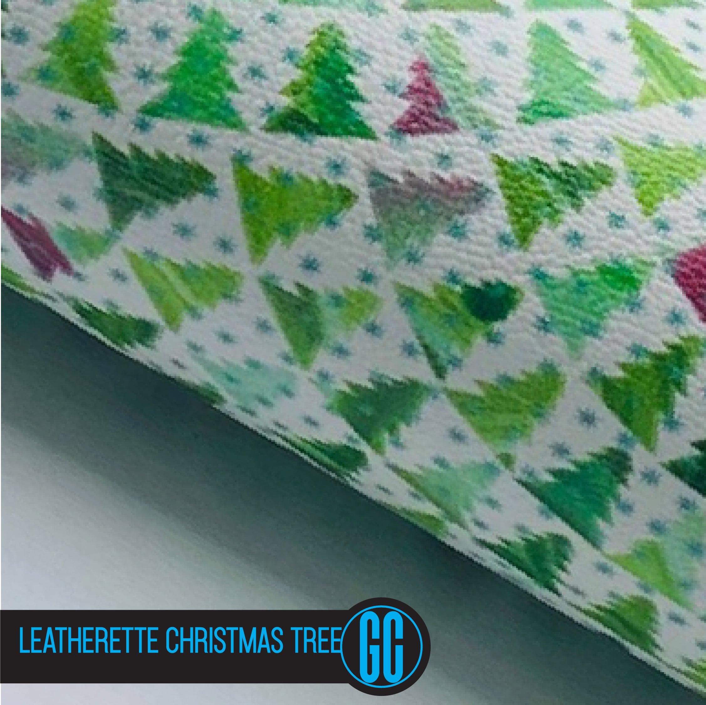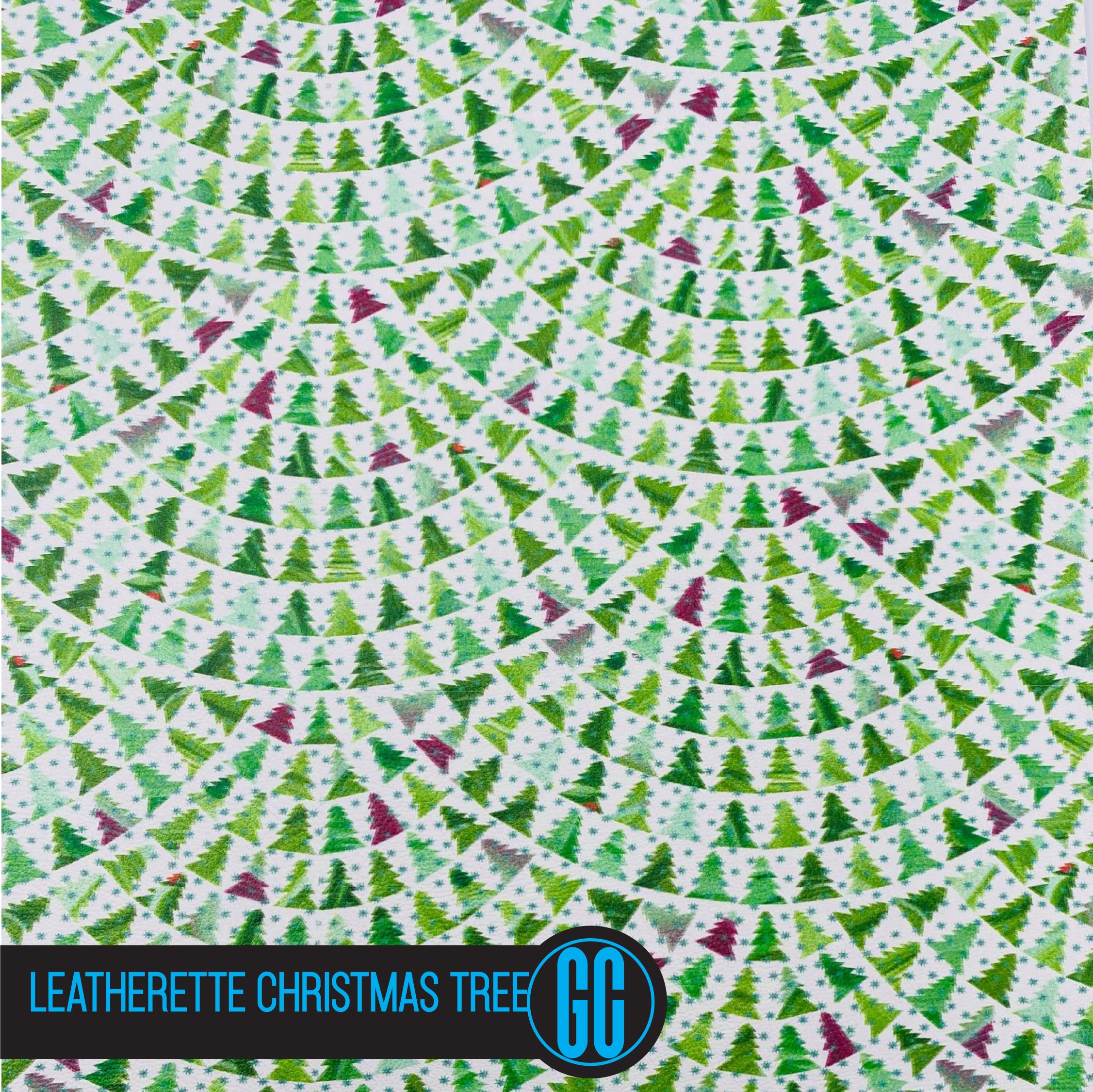 100% Cotton backed Leatherette Christmas Tree Printed Glitter Fabric. Available in A4 Size.