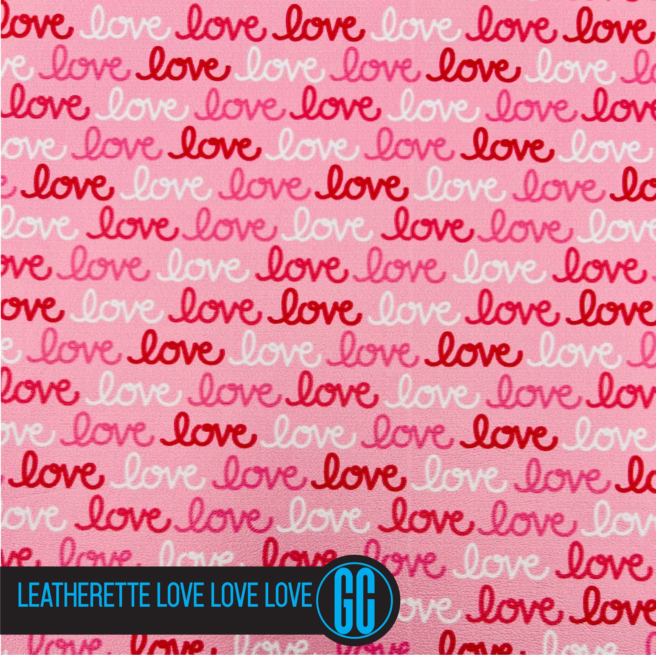100% Cotton backed Leatherette Love Love Love Printed Glitter Fabric. Available in A4 Size.