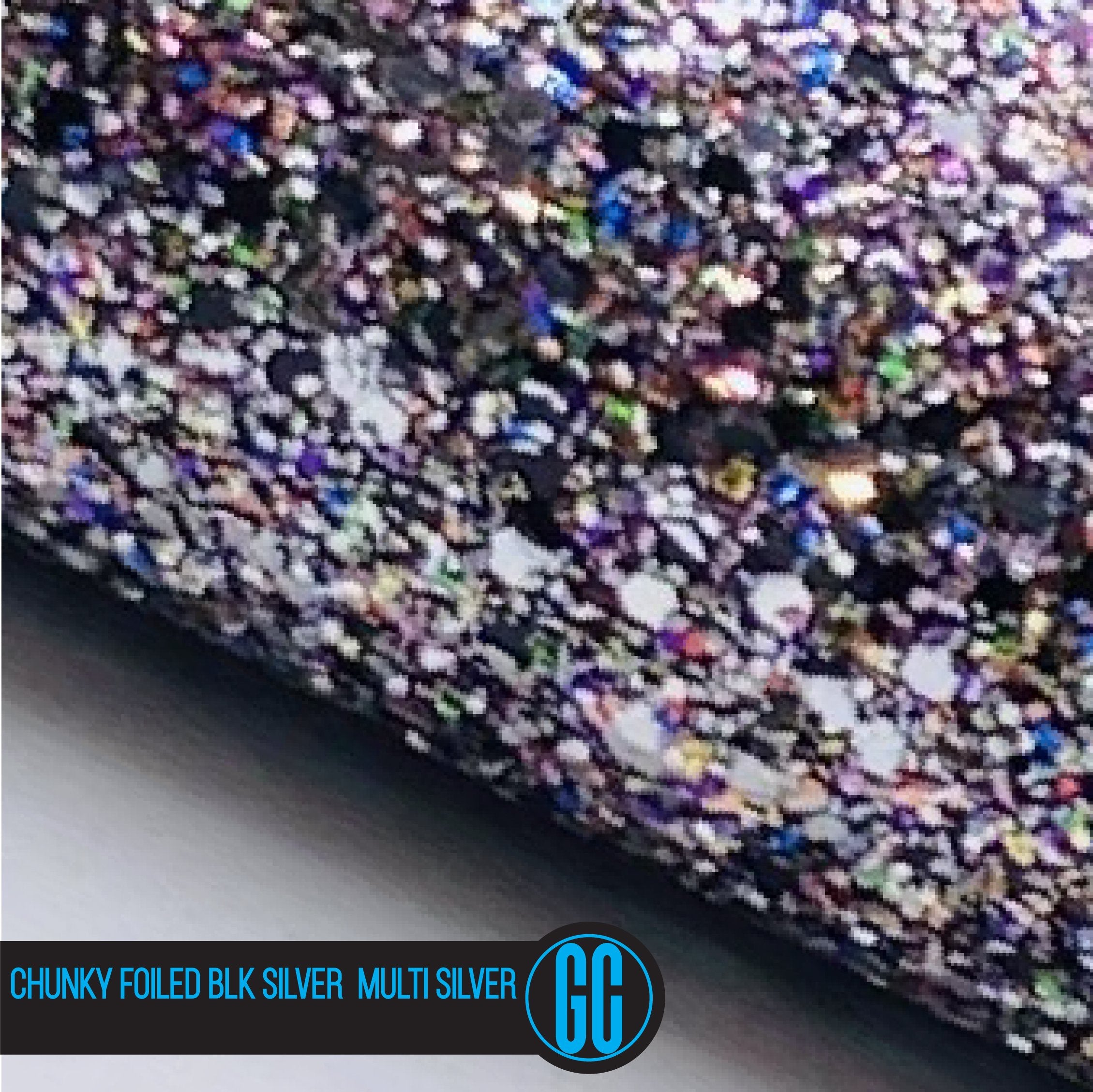 100% Cotton backed Chunky Foiled Black-Silver-Multi / Silver Glitter Fabric. Available in A4 Size.
