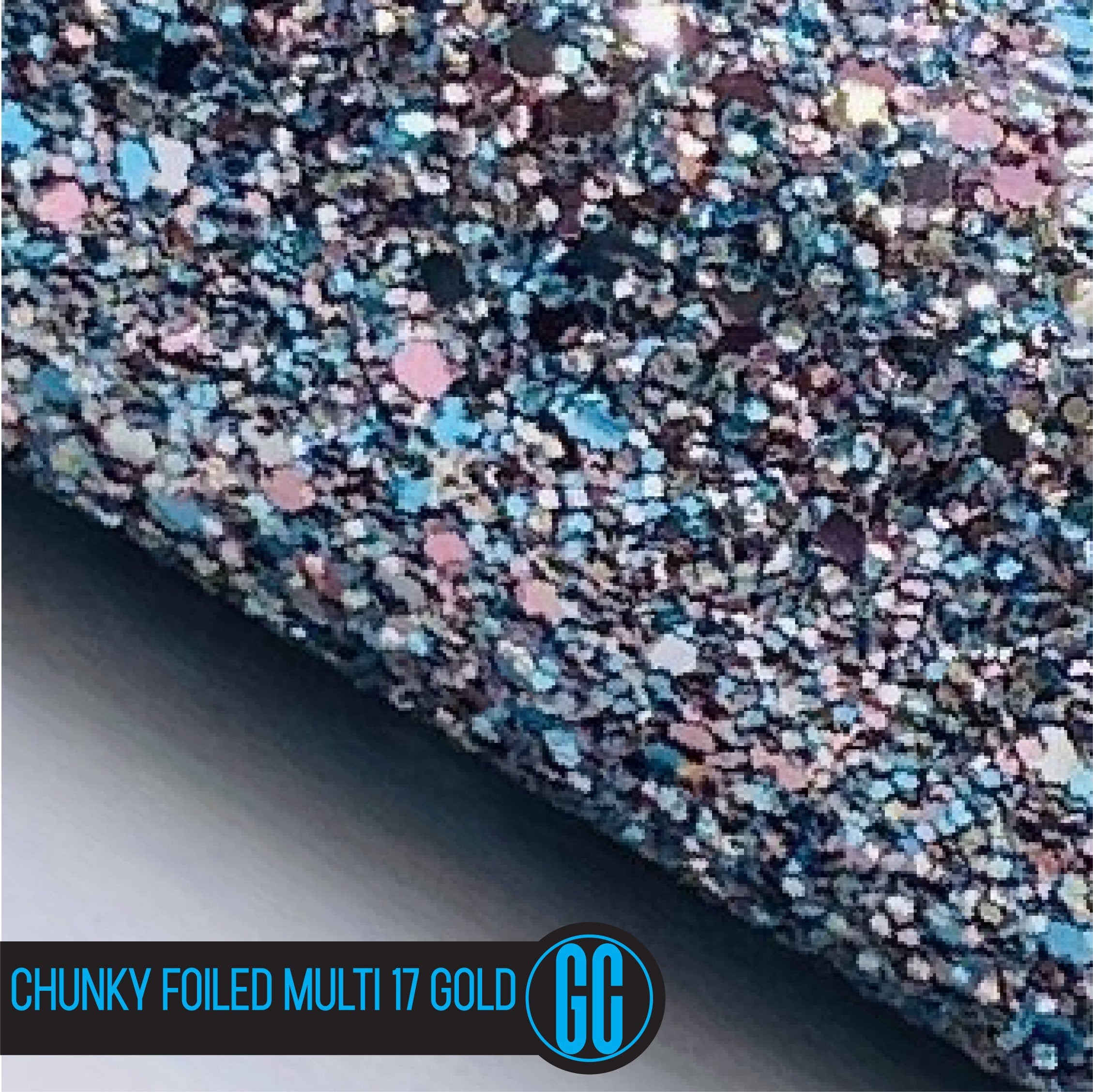 100% Cotton backed Chunky Foiled Multi 17 / Gold Glitter Fabric. Available in A4 Size.