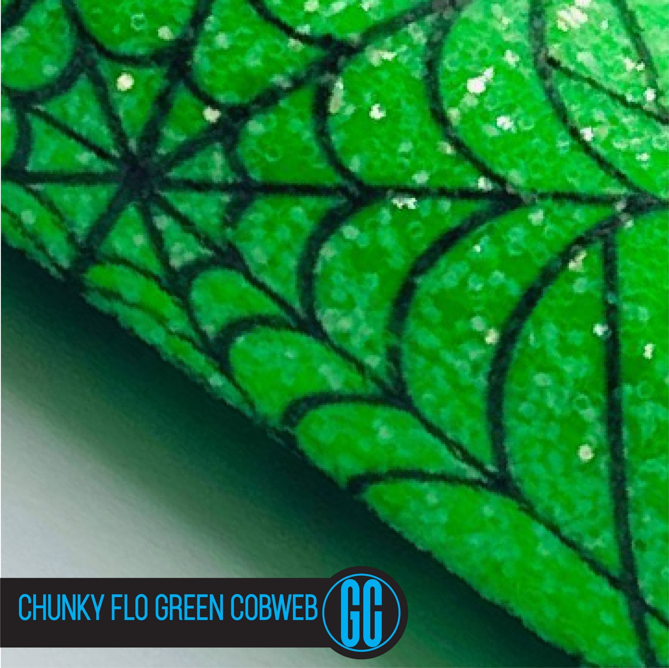 100% Cotton backed  Fluorescent Green Glitter with Cobweb Pattern Glitter Fabric. Available in A4 Size.