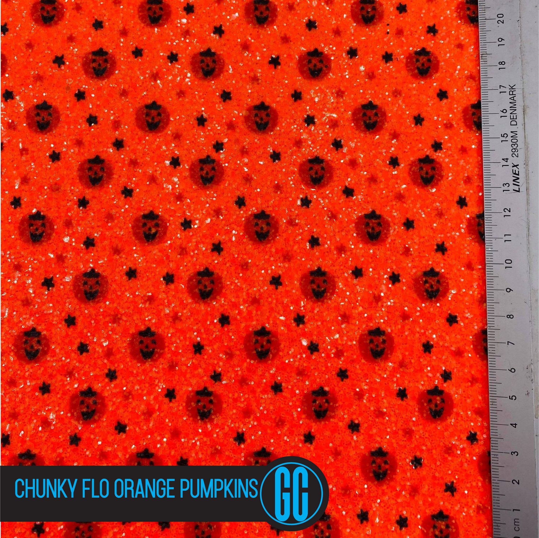 100% Cotton backed Fluorescent Orange Glitter with Pumpkin Pattern Glitter Fabric. Available in A4 Size.