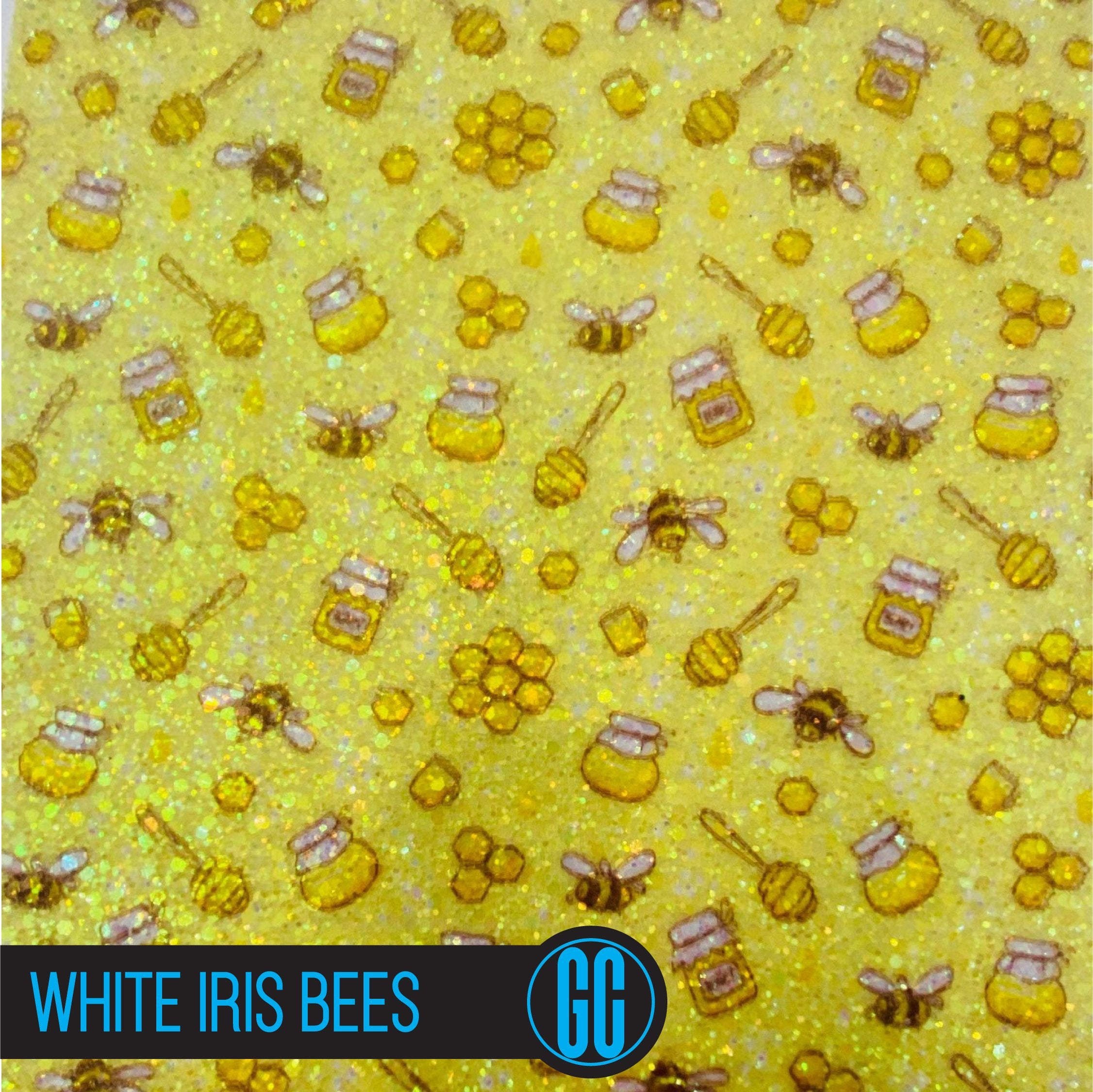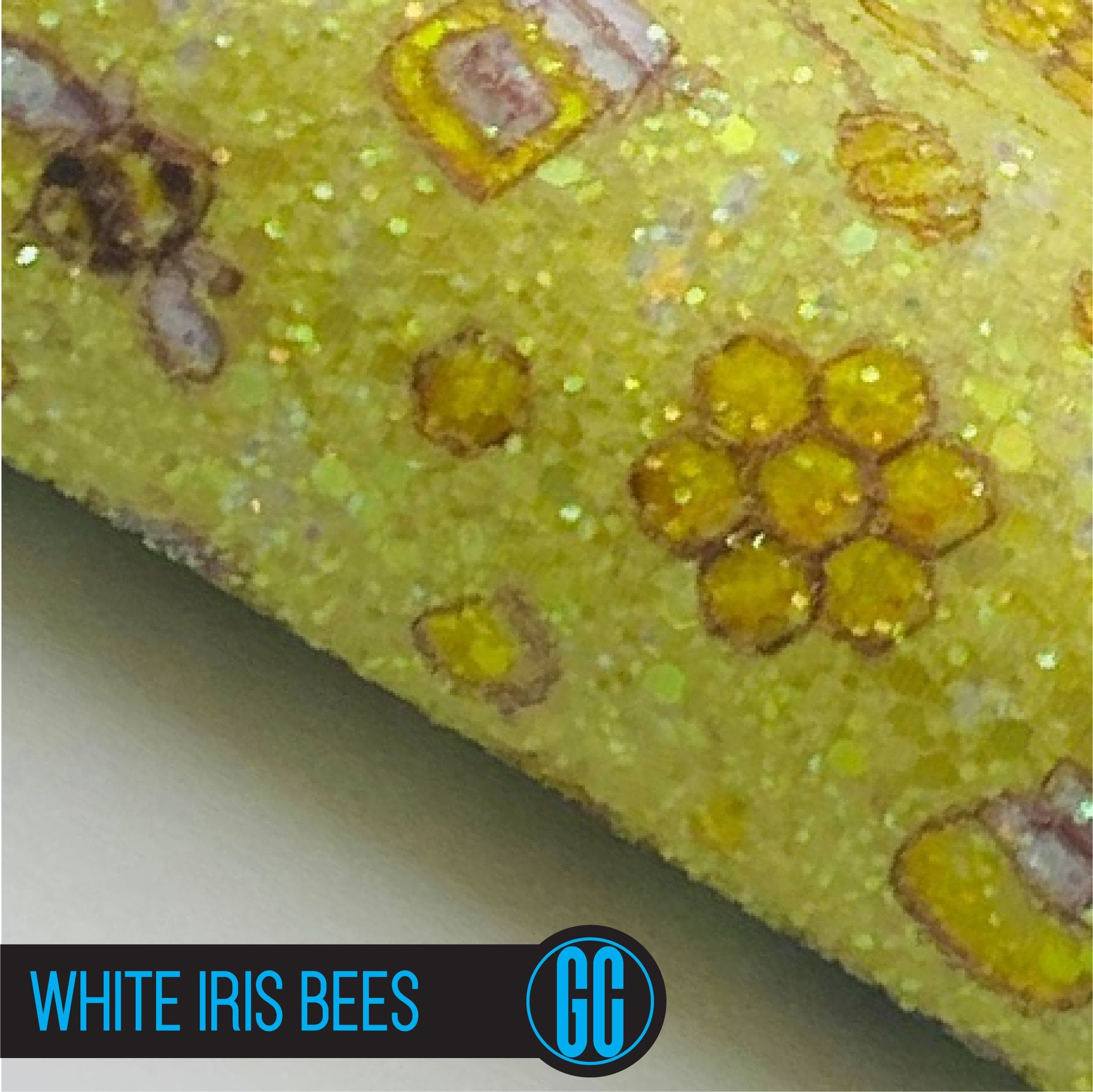 100% Cotton backed White Iris Bees Printed Glitter Fabric. Available in A4 Size.