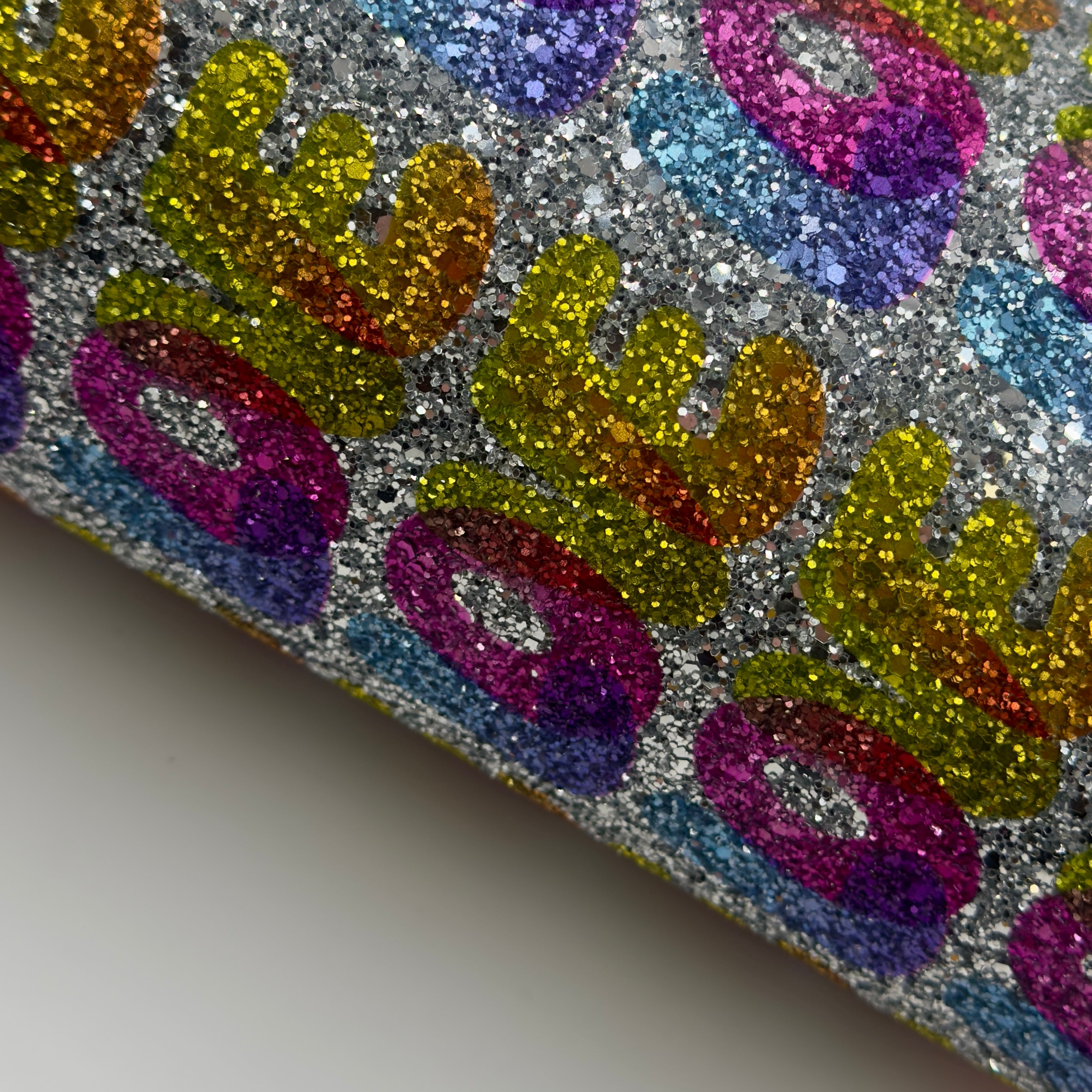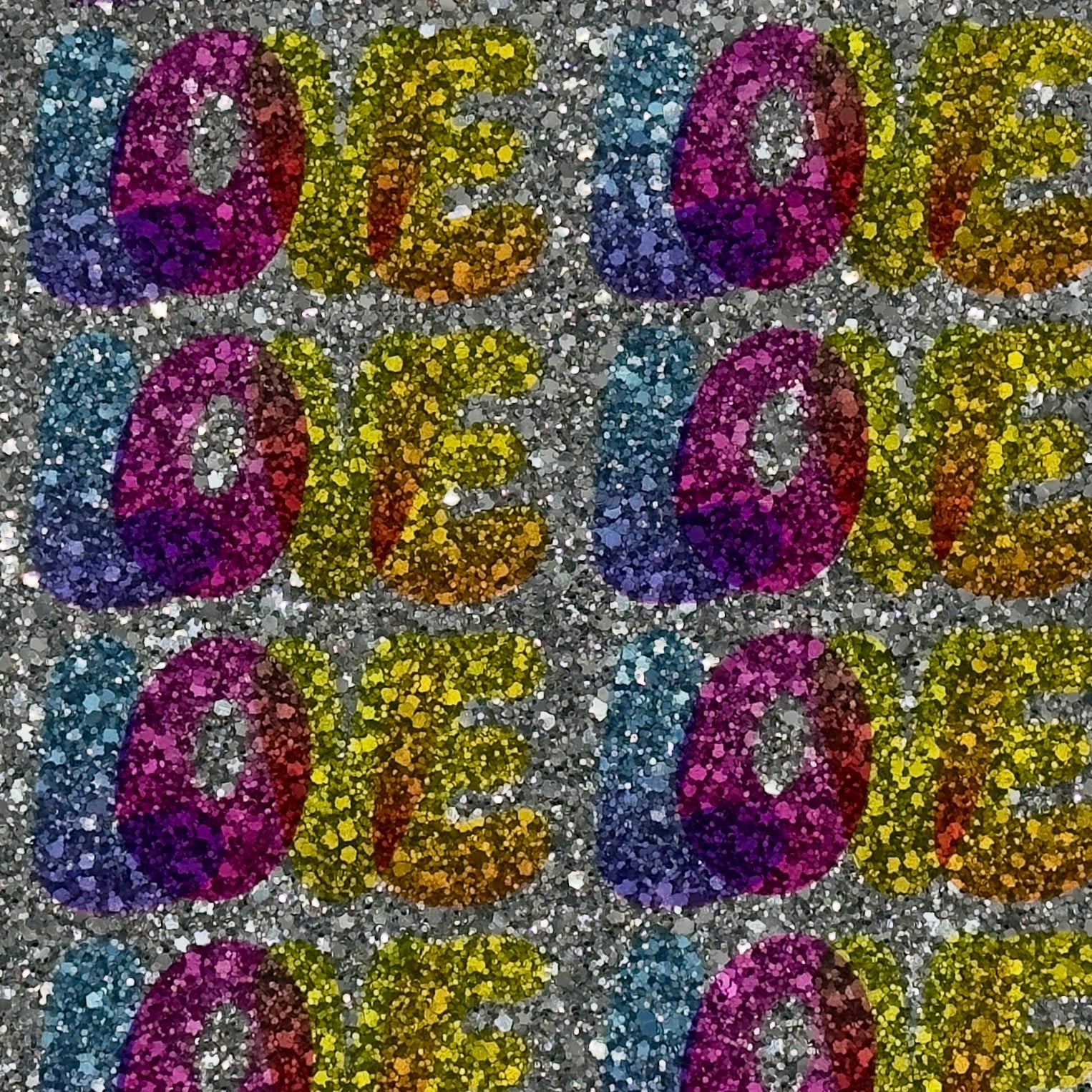 Playful, colourful and full of positive energy — our A4 Size Silver Lots of “Love” Screen Print Effect Glitter Fabric features a repeating LOVE typography design inspired by classic screen print techniques, layered over a shimmering silver glitter base. The bold blocks of overlapping colour and rhythmic layout create a lively, eye-catching pattern that feels fun, modern and unmistakably joyful.