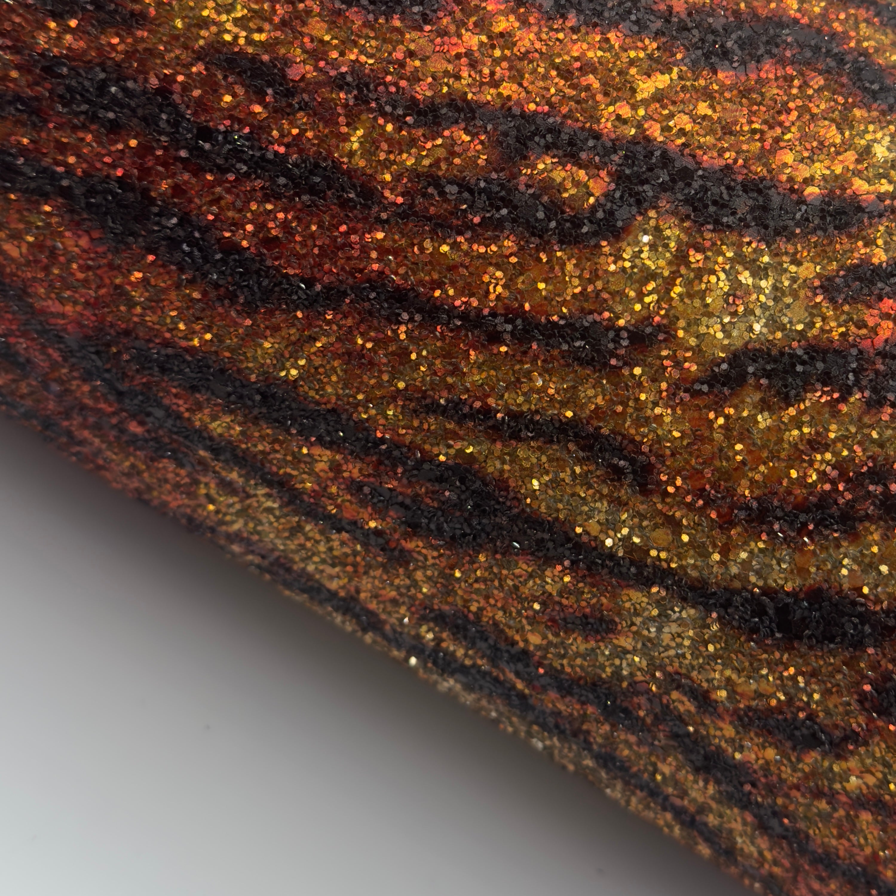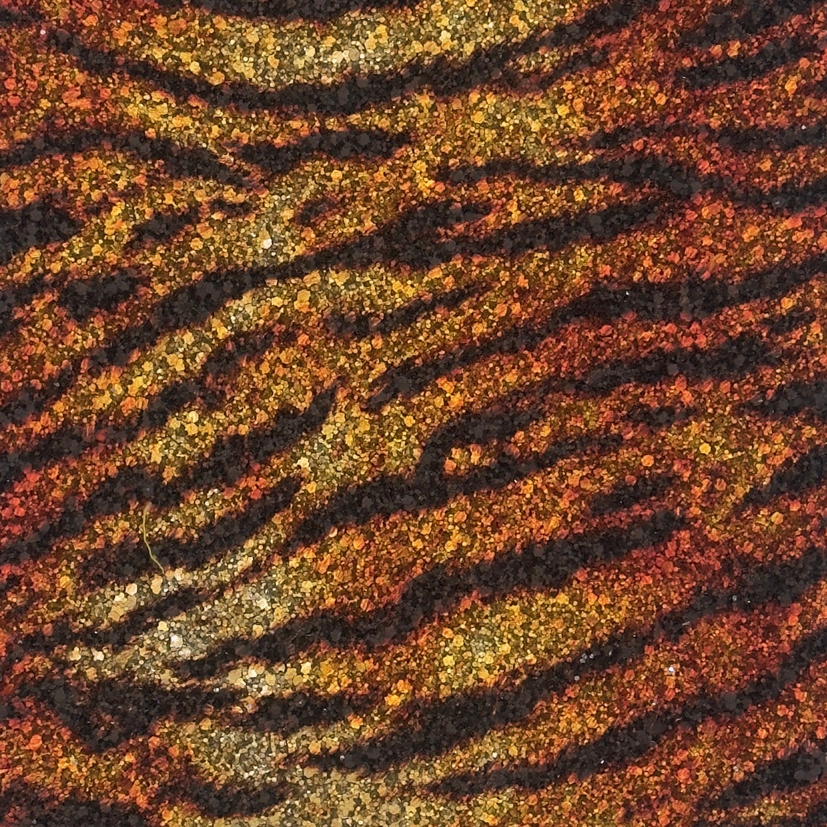 Bold, dynamic and full of movement — our A4 Size Silver Tiger Printed Glitter Fabric features a striking tiger-inspired stripe pattern layered over a shimmering silver glitter base. The flowing black stripes sit against warm amber and gold tones, creating a powerful, high-impact design that feels fierce, fashion-forward and unmistakably eye-catching.