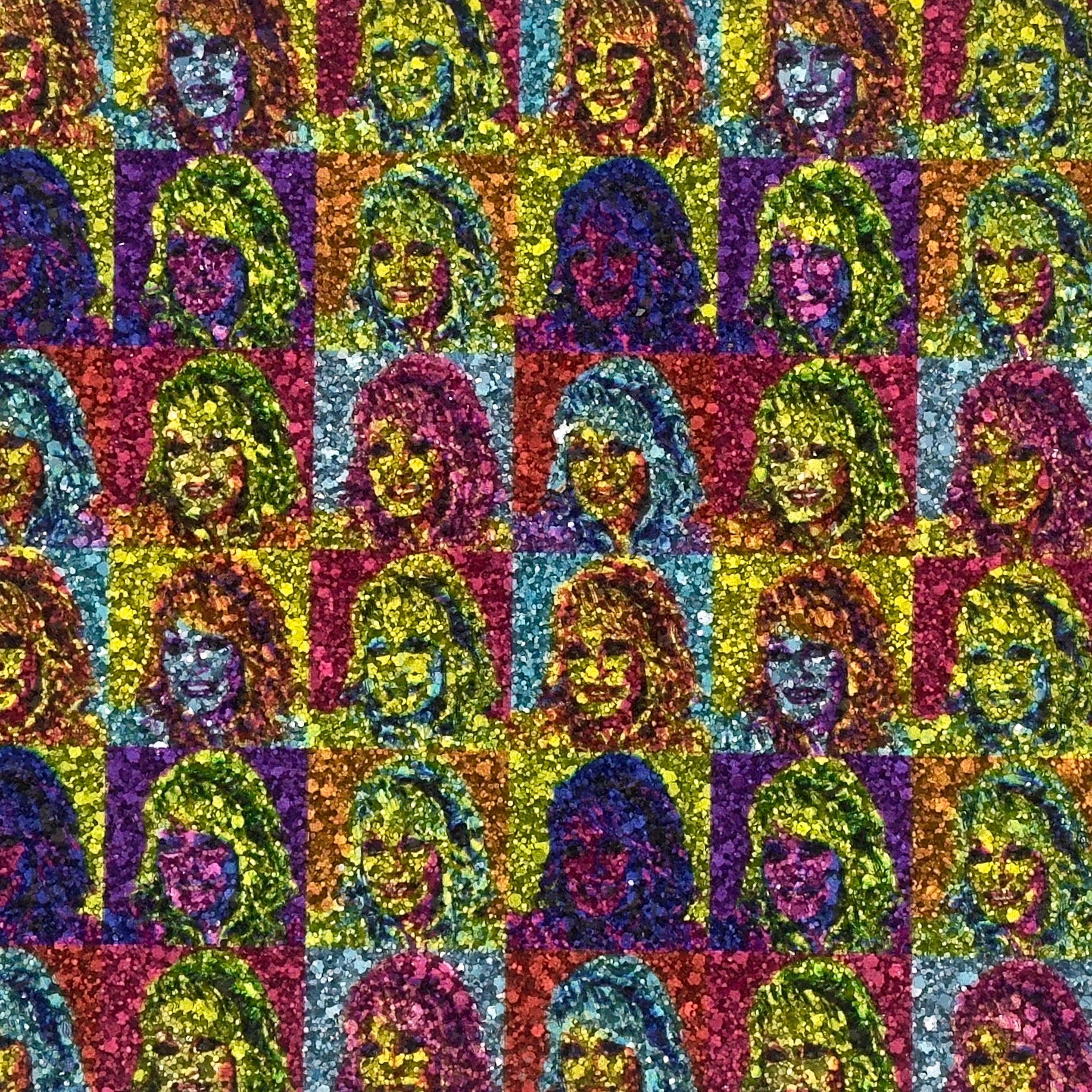 Design: Silver glitter base with multi-colour Dolly pop-art landscape print